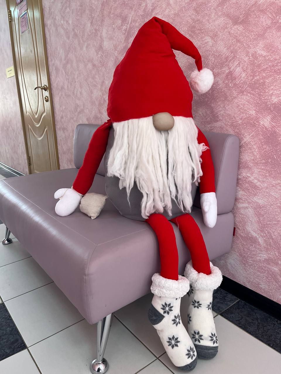 Неподалеку на мягком диване расположился самый большой гном. Говорят, он живет в детском саду не первый год и полюбился многим калужанам. Некоторые, не удержавшись, проходя мимо, пожимают ему руку.