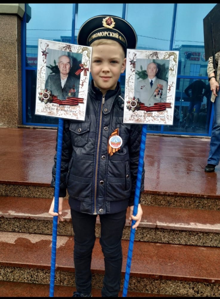 Еще маленький Саша несет портреты дедушек из дома престарелых.