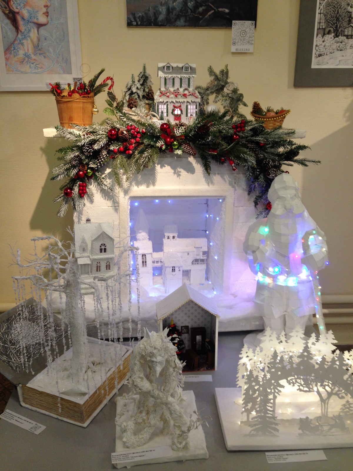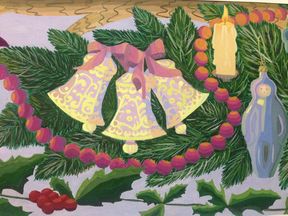 На стенах – новогодние открытки, керамические рельефы из белой глины бисера, стекла, глазури, причем, самому маленькому художнику, создавшему такой рельеф Леониду ВИКТОРОВИЧУ всего 4 годика.