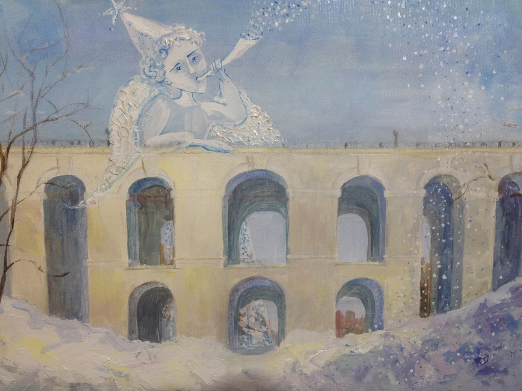 А у взрослых калужан из студии «Горизонт» получилась волшебная серия работ «Рождественское чудо над Калугой».