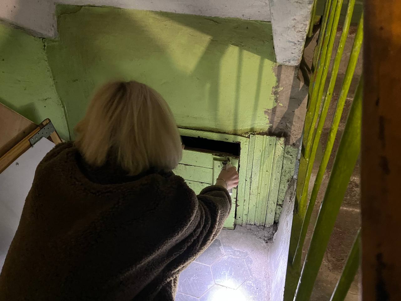На наш вопрос, как попасть в подвал, Наталья снова заходит в подъезд. Здесь, на первом этаже под лестницей, видим небольшую дверцу.