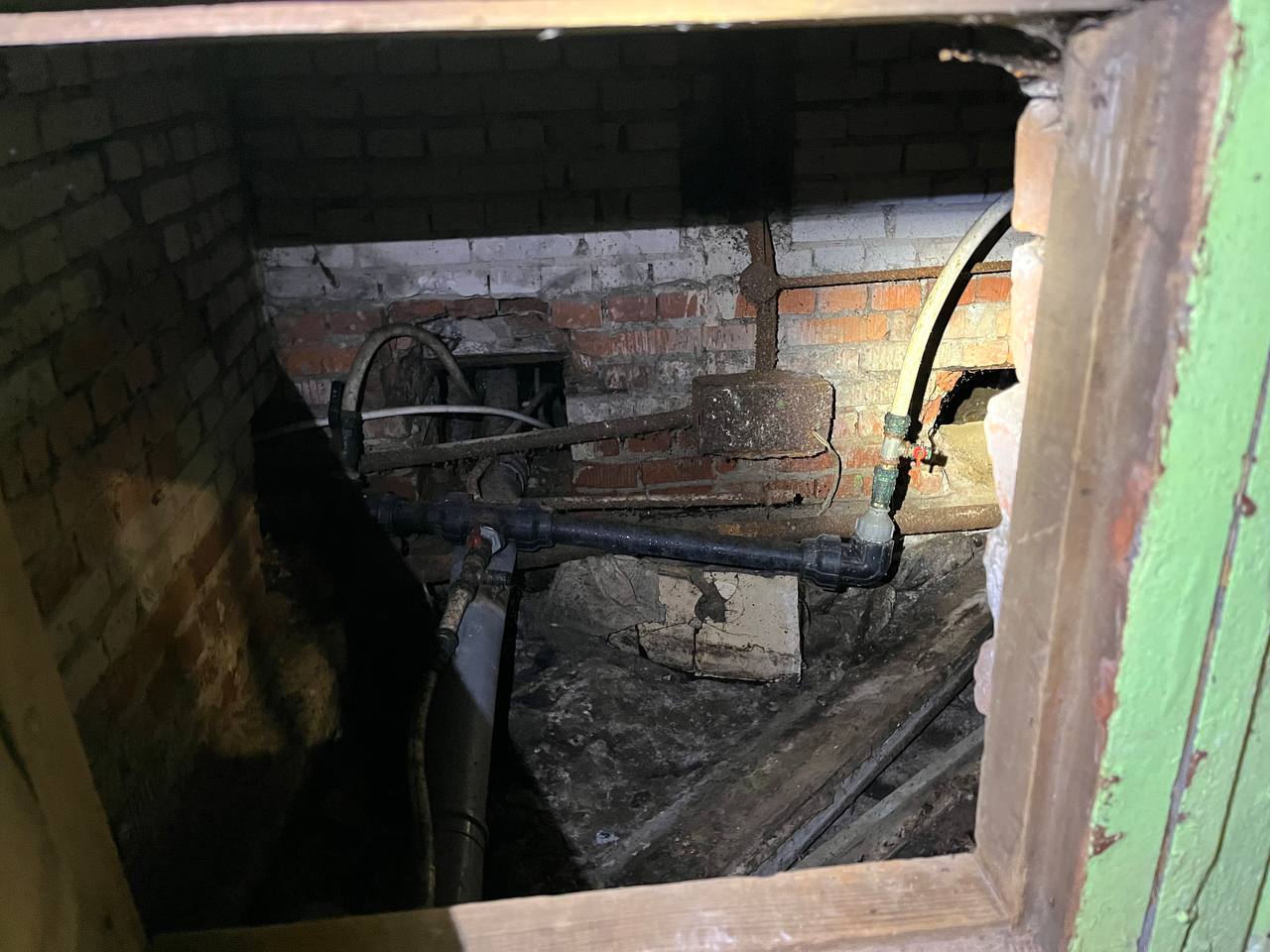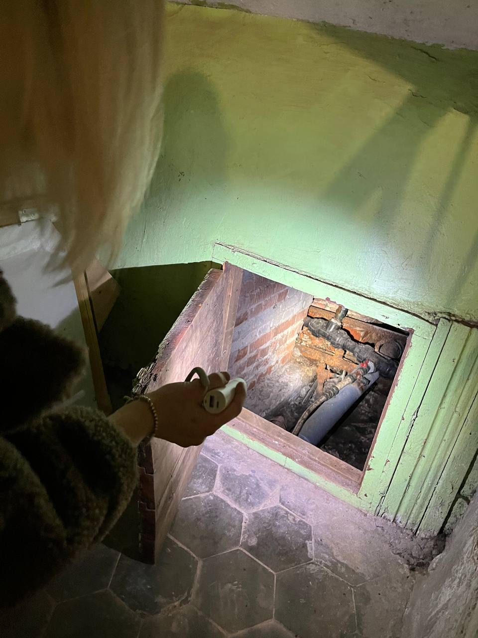 Женщина с усилием открывает тяжелую деревянную дверцу. Вместе с затхлым запахом из подвала на нас вылетают мошки. Внутри видим коммуникации, но спуститься к ним, действительно, непросто.