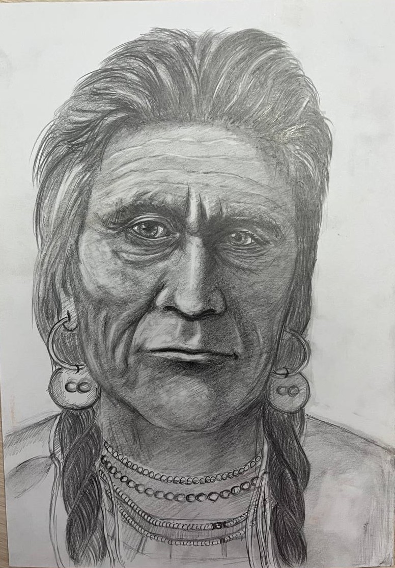 Вот этот индеец мне понравился. Когда я его нарисовала, увидела, конечно, что один глаз у него больше, другой меньше, что одна половина лица сильно отличается от другой, но он все равно мне нравится.