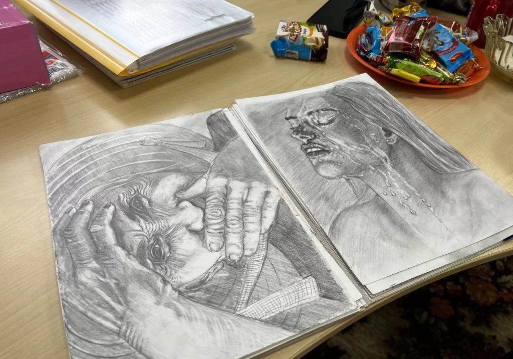 Мы заглянули в центр в гости к Татьяне Григорьевне, на столе нас ждал горячий кофе со сладостями, а в стороне лежала папка с рисунками женщины.