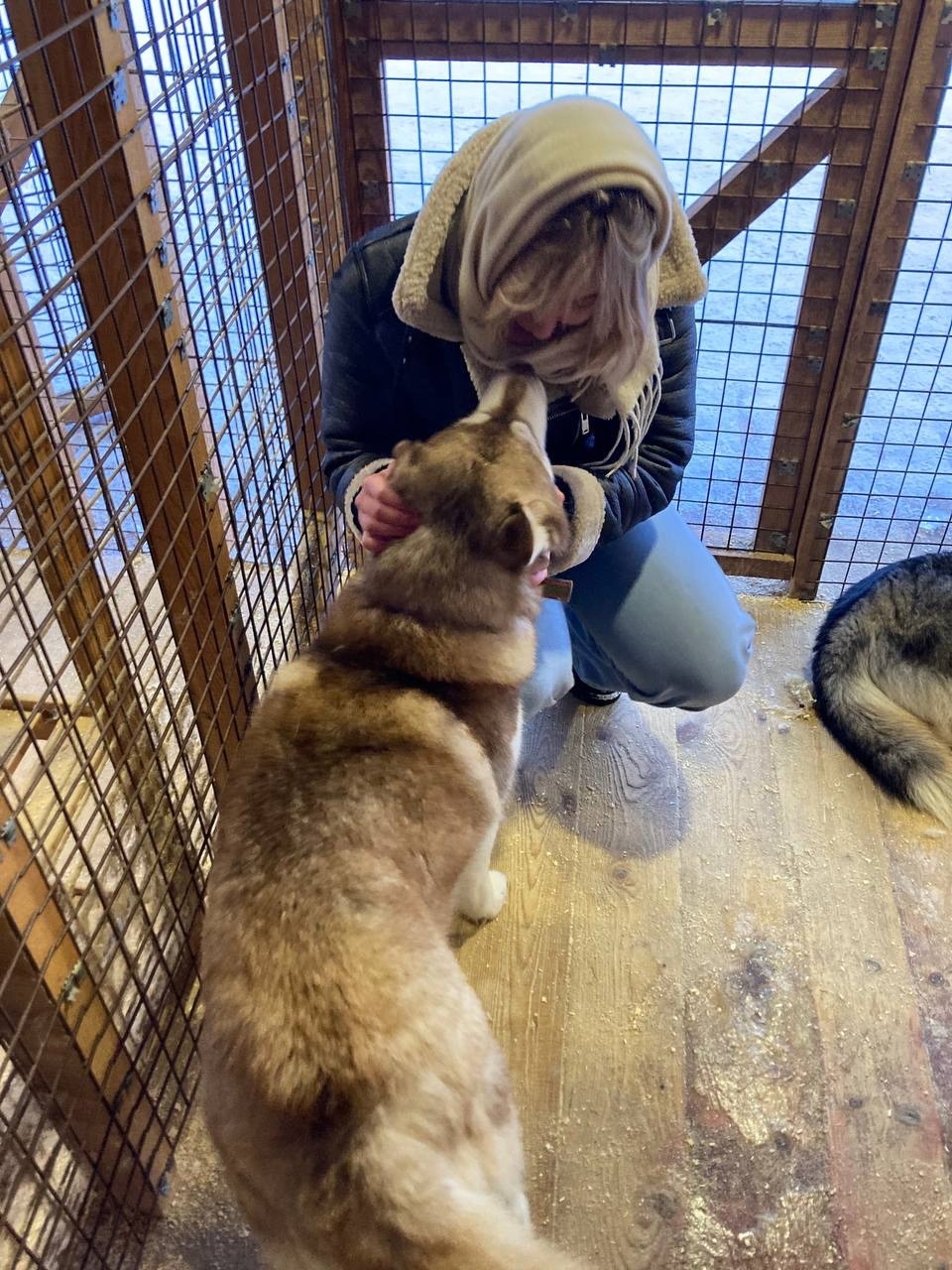 После катания все отправились погреться и попить чай. Спустя 15 минут небольшого отдыха нас позвали на экскурсию по питомнику. В «Эльбрусе» живут 50 собак северных ездовых пород – хаски, маламуты, самоеды и метисы. Нам подробно рассказали про каждого четвероного друга и разрешили зайти в вольеры. После этого начался сеанс психологической помощи. При входе в вольер собаки окружили нас вниманием и любовью. Главное, снимите перчатки! Собаки очень любят ими перекусить и будут активно отбирать у вас этот аксессуар.