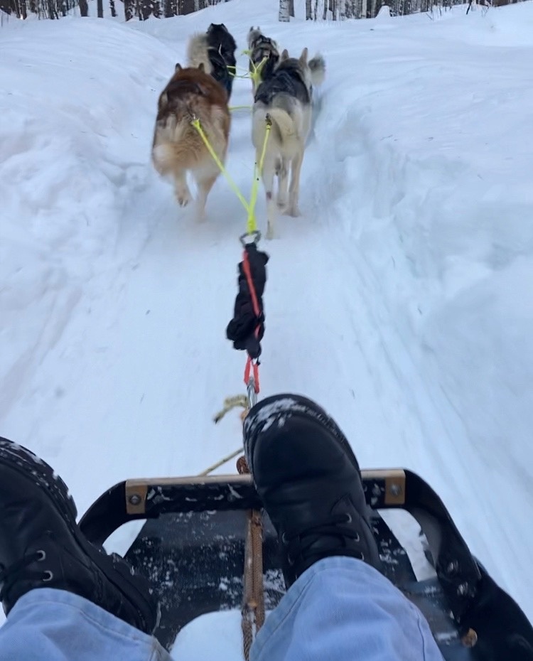 Мы решили самостоятельно попробовать поуправлять упряжкой. Перед началом езды каюр издает непередаваемый текстом звук, который означает «Хоп, хоп – вперед». Первый наш круг завершился падением, и я оказалась в сугробе. Собаки заметили потерю управляющего и немного приостановились, как будто понимая, что я немного испугалась.