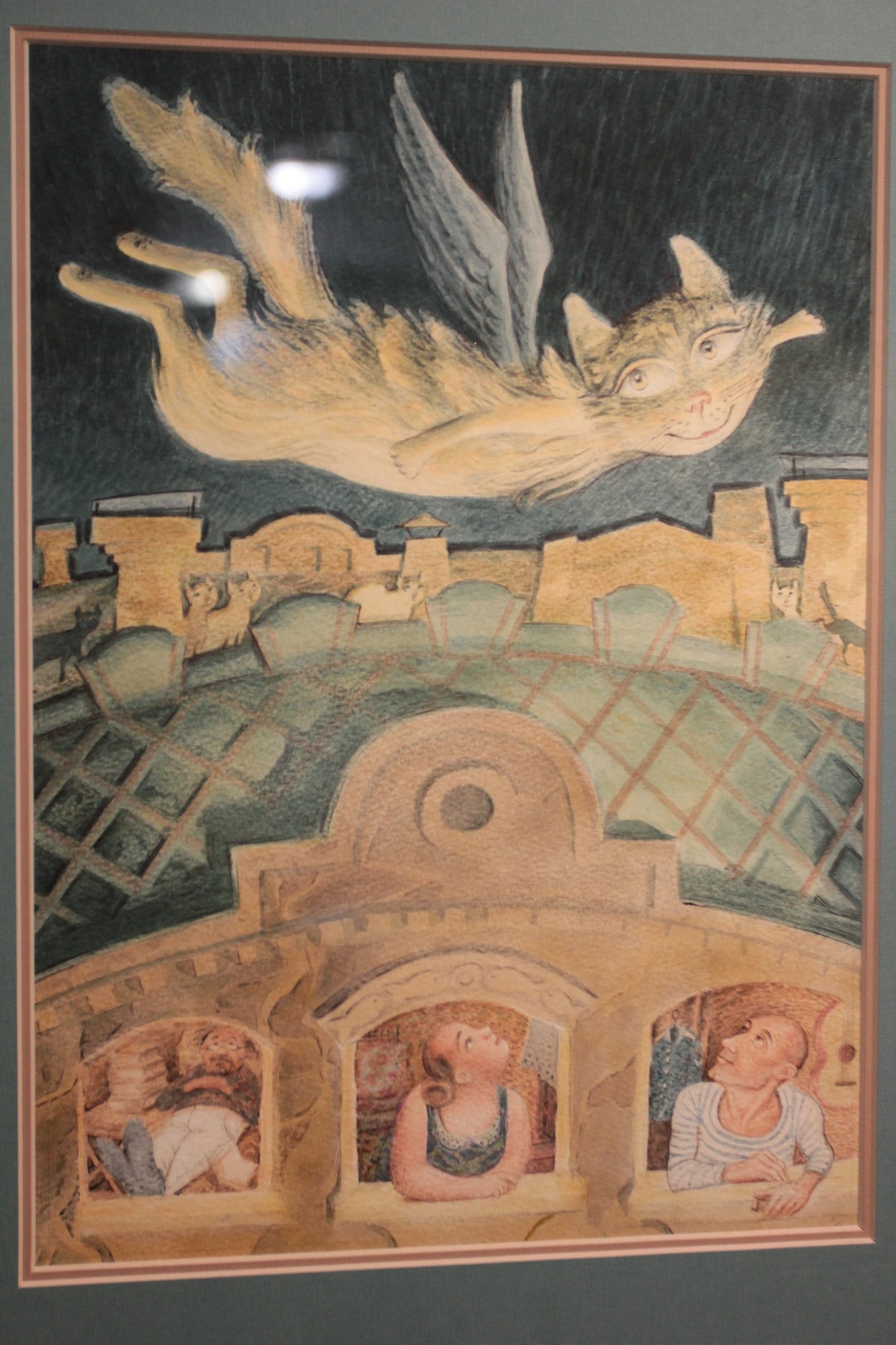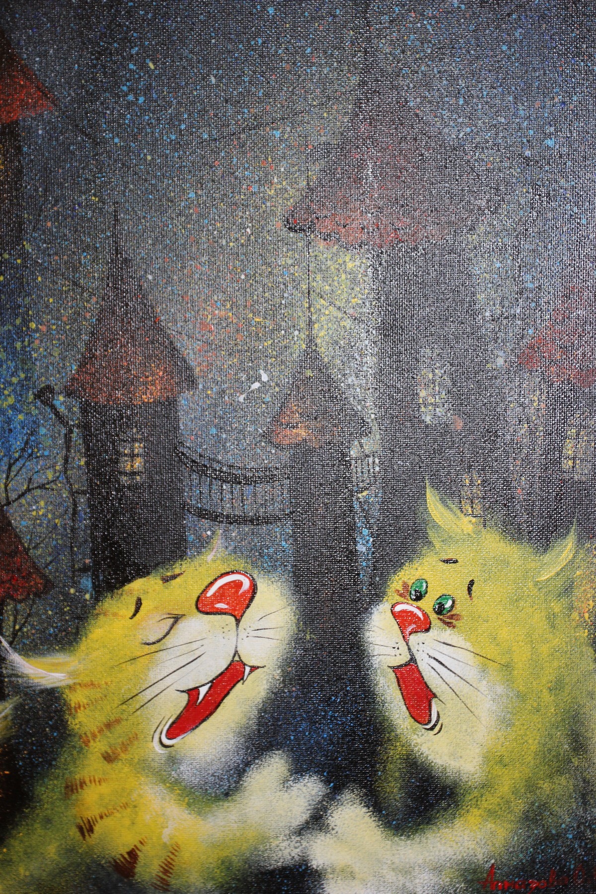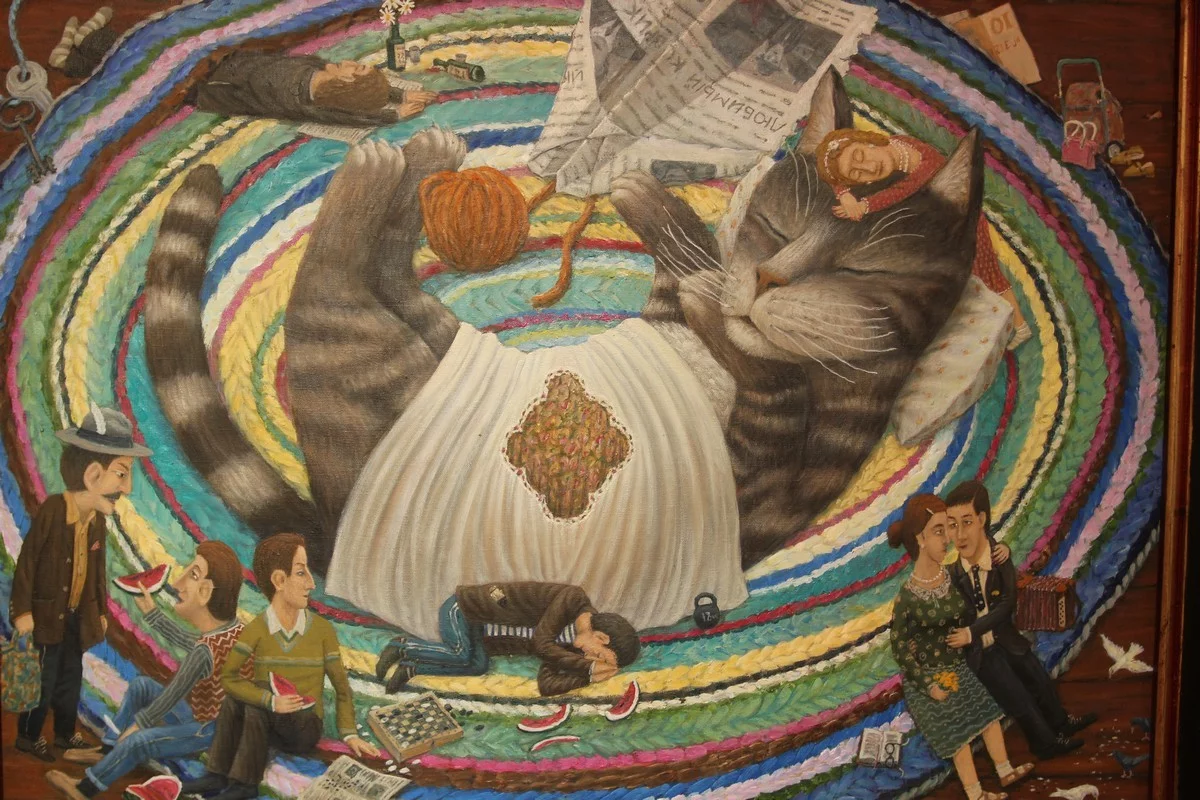 Кошки попали на картины калужских художников, разместились на стенах, на дереве, на заборе и просят «меньше ворчать, больше мурчать».