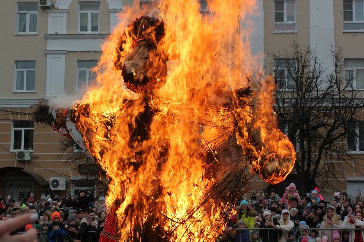 Самым популярным действом на празднике стало сжигание чучела. Чтобы оказаться в первых рядах, народ занимал места за полчаса. Скоморохи, пробирающиеся через толпу, пройти к чучелу не смогли. Народ стоял очень плотно.