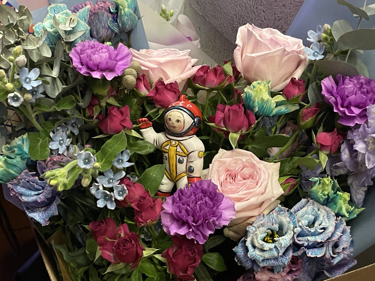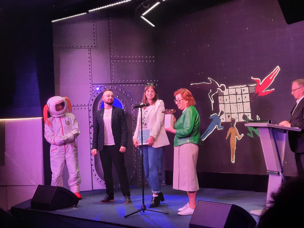 Выступающим на сцене дамам подарили цветы с маленькими космонавтиками