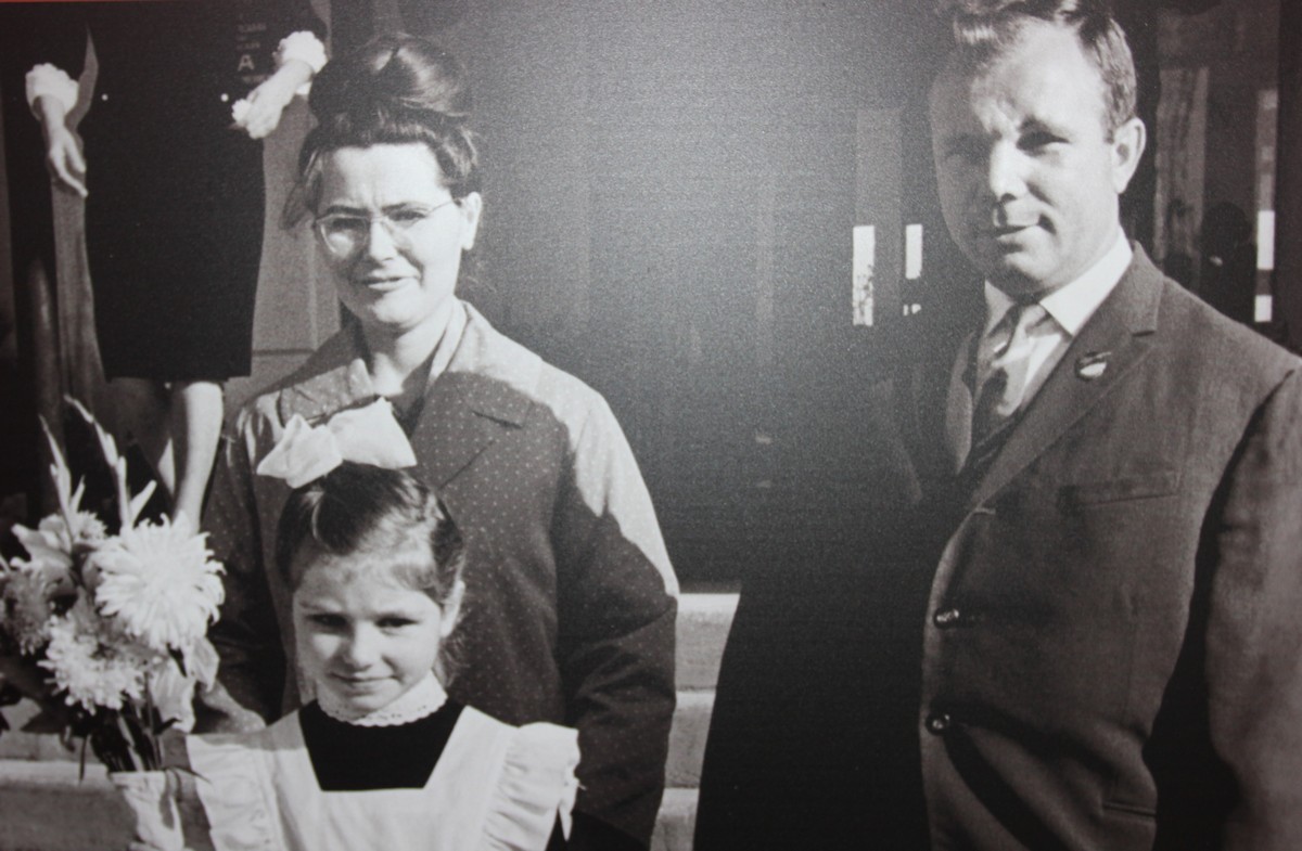 Гагарин с женой Валентиной и дочерью-первоклассницей Леной.