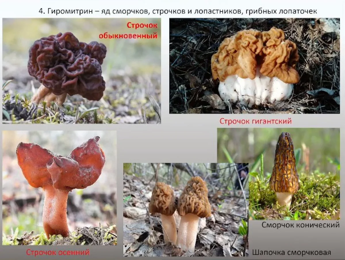 Интересны строчки, сморчки. В Германии все строчки запрещены. Ими в Европе регулярно травятся. У нас считается: если строчок наберет много солнечных дней, это важно для яда гиромитрина, который в нем содержится, он может стать очень ядовитым.
