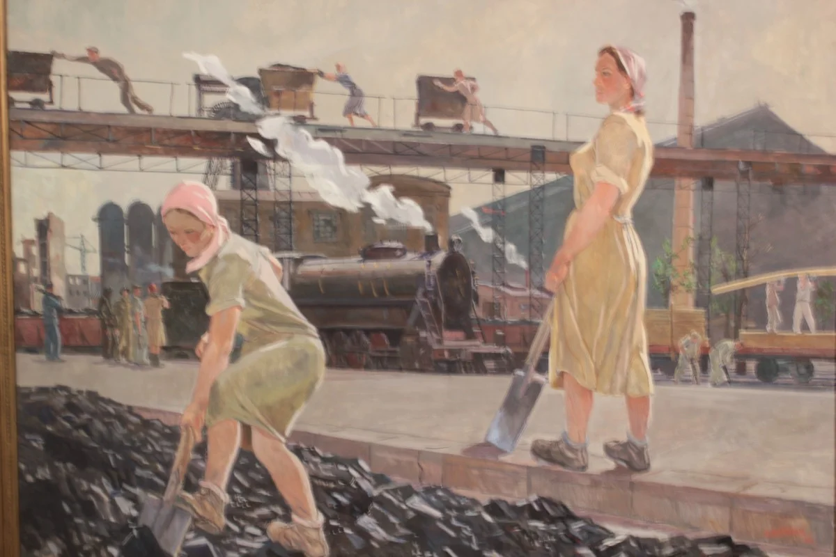 А в более поздних работах видим тех людей, которые страну вытащили. Мы вышли из войны в ужасном состоянии: заводы уничтожены, все разрушено, люди погибли.