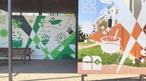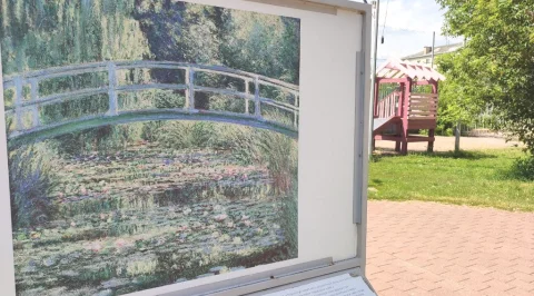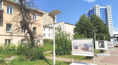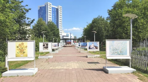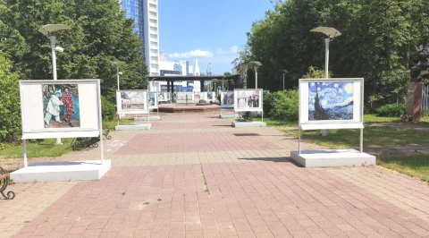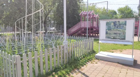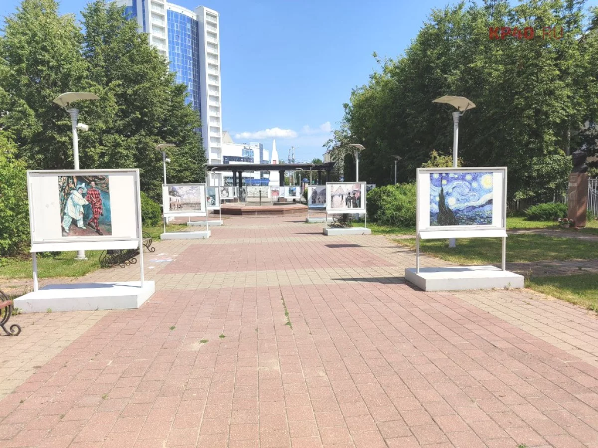 Расставленные по всему скверу репродукции картин с природой и водой свежести совсем не добавляют. Кафкианства добавляет непонятное сооружение из железных прутьев и пустынная детская площадка. Привести сюда ребенка днем не сможет даже самый ярый детоненавистник.