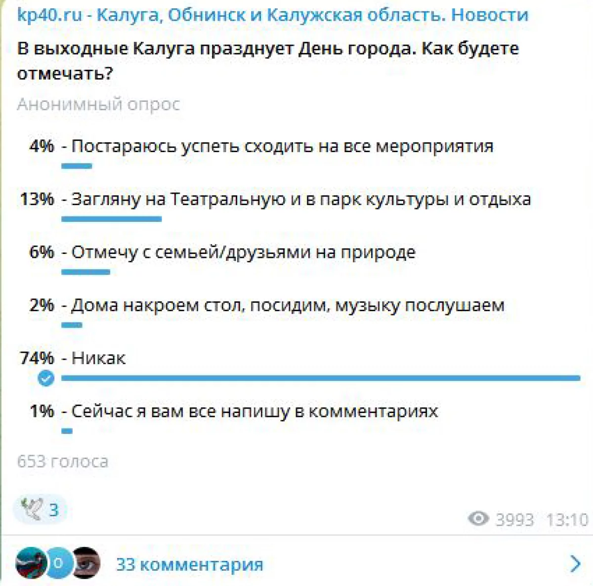 Безусловно, объективное представление о сложившемся мнении горожан наш скромный опрос в телеграм-канале не может дать. Репрезентативности не будет, однако в голосовании приняло участие больше 500 человек. Среди них и такие, кто считает, что именно сейчас не нужен праздник, и те, кто вообще против Дня города в принципе, и те, кто просто не отмечает его на улицах Калуги.