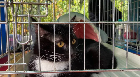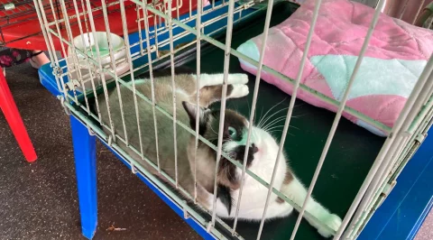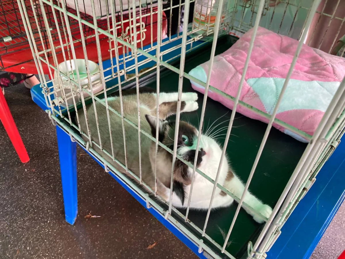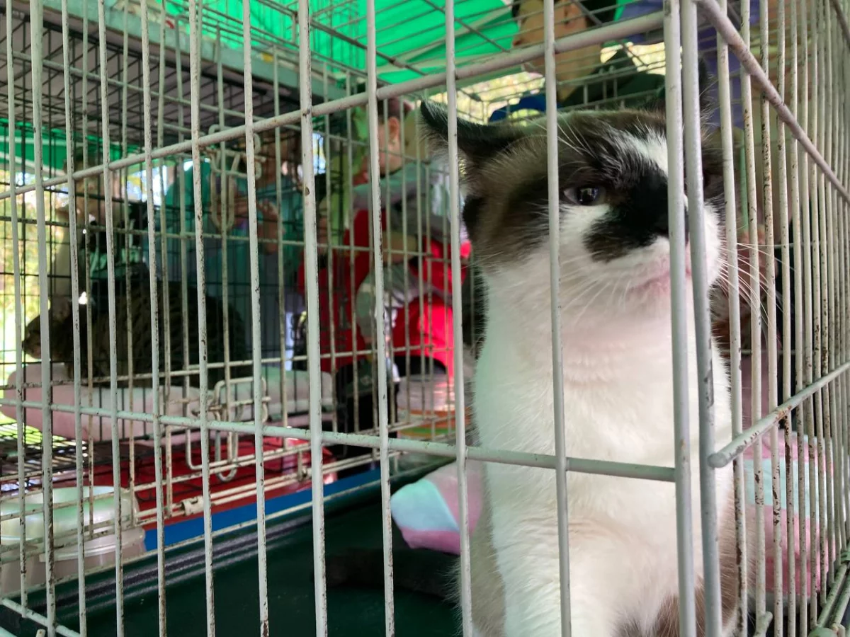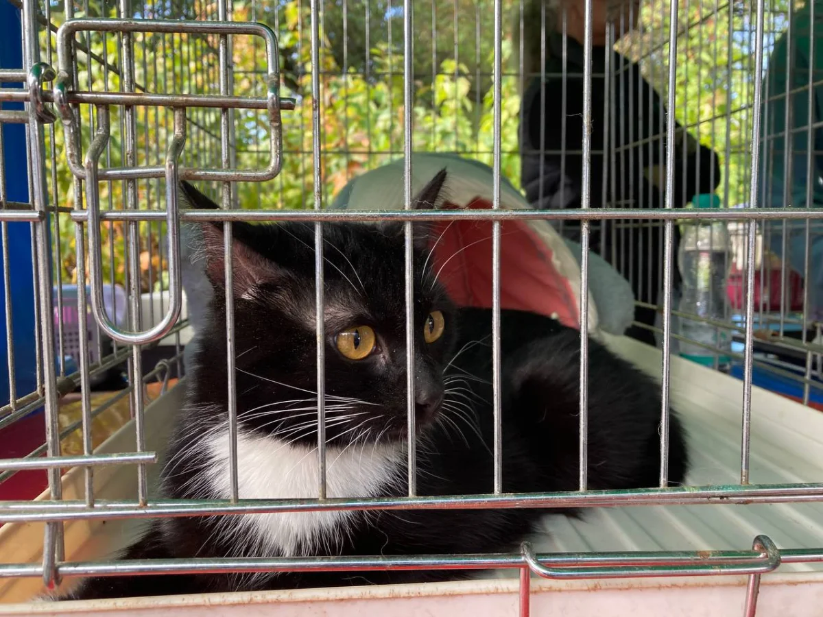 Мы направились к клеткам с кошками, которые собрали около себя больше всего прохожих. Там стояли две переноски с самыми контактными кошками, которые с удовольствием принимали лучи любви от калужан.