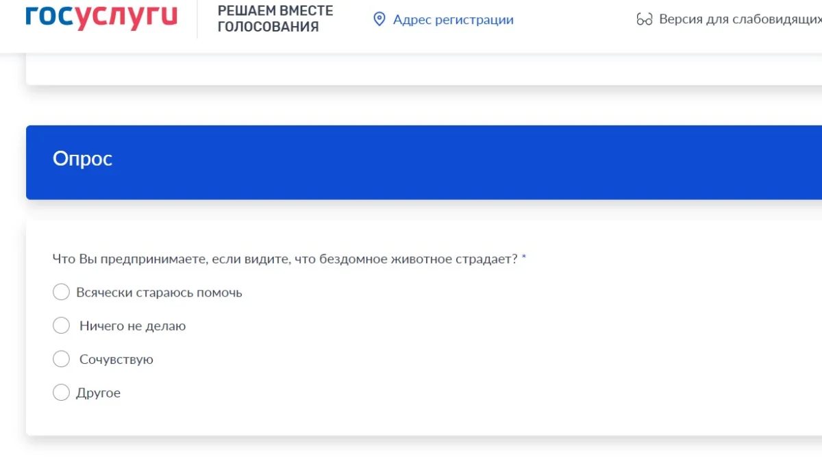 Вопрос явно из области психиатрии: «Что Вы предпринимаете, если видите, что бездомное животное страдает?». На момент публикации на него ответили 230 человек.