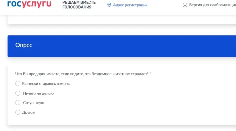 Например, на уже упомянутый вопрос: «Что Вы предпринимаете, если видите, что бездомное животное страдает?» Среди вариантов ответа предлагается отметить:
