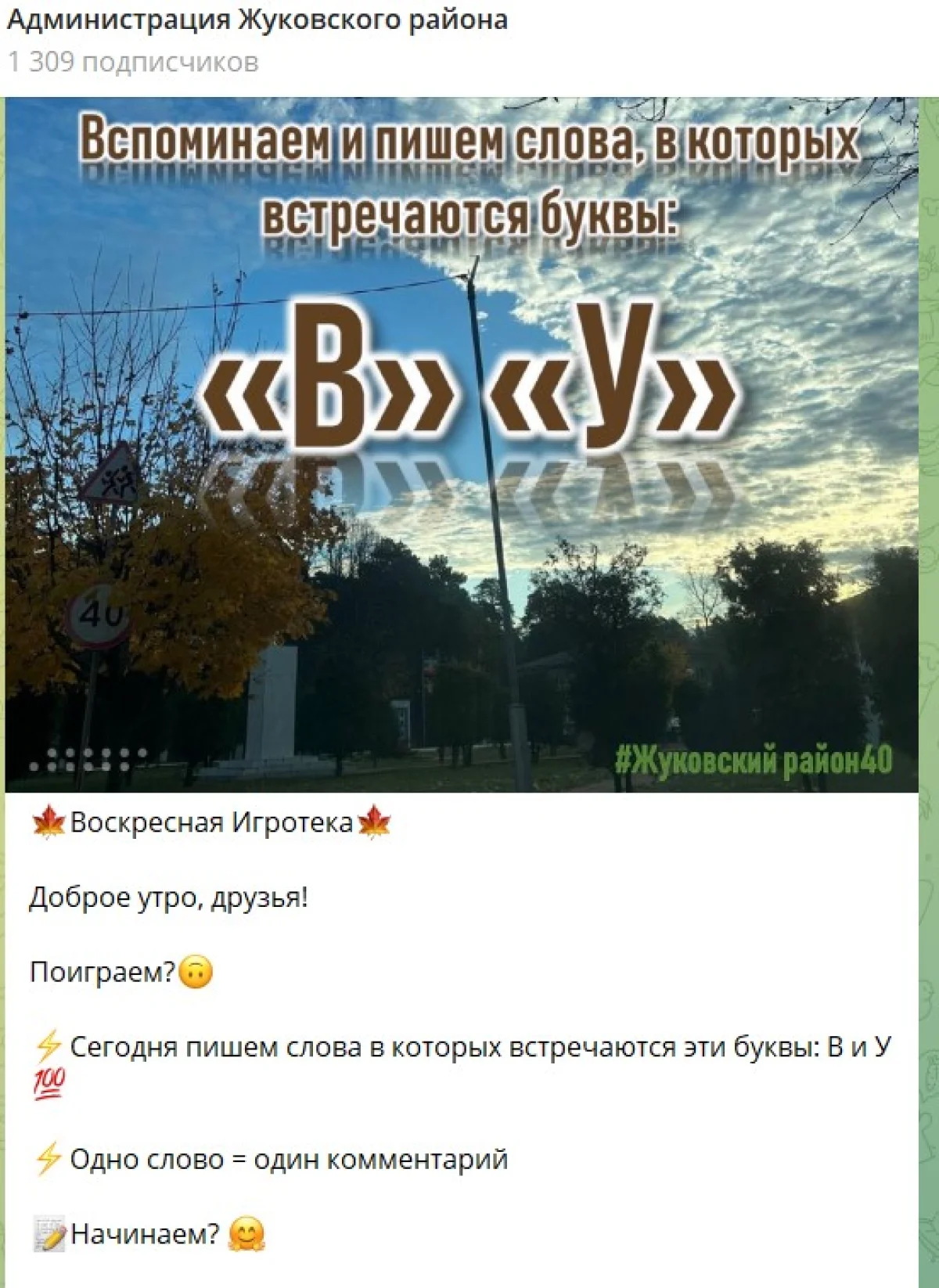Администрация Жуковского района пишет: «Вспоминаем и пишем слова, в которых встречаются буквы «В» и «У».