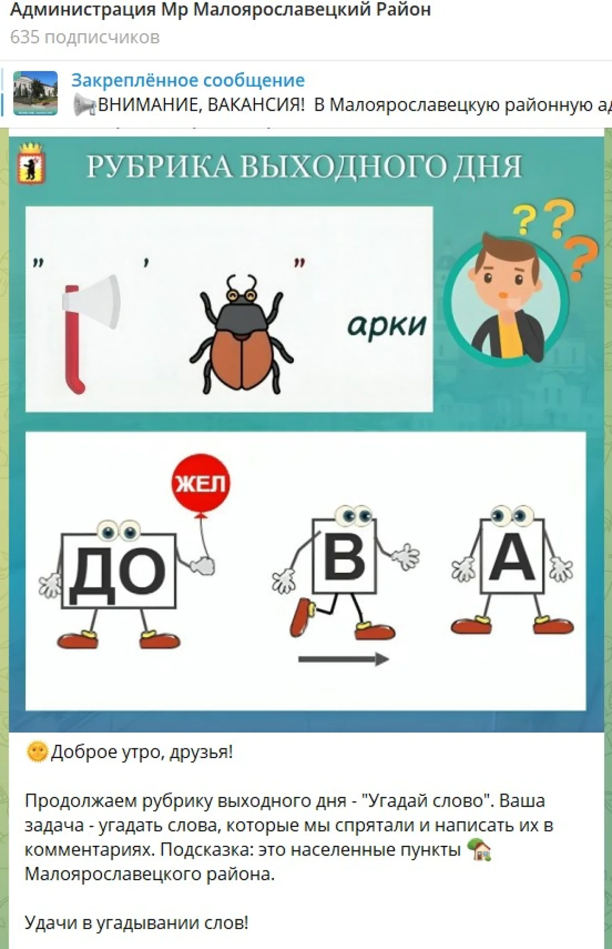 К примеру, администрация Малоярославецкого района предлагает зашедшим на ее официальную страницу «Угадать слова, которые мы спрятали».