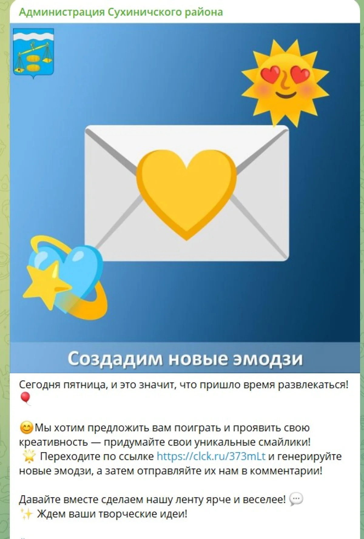 Администрация Сухиничского района начинает развлекаться уже в пятницу: «Сегодня пятница, и это значит, что пришло время развлекаться. Создадим новые эмодзи!»