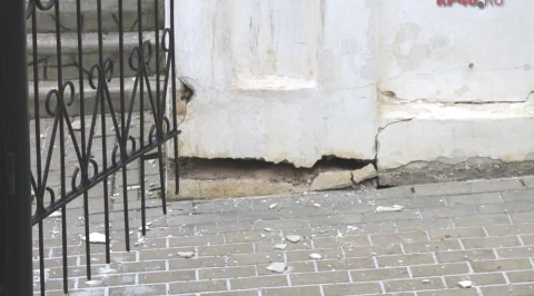 В четверг у ворот храма работали коммунальные службы. Как объяснили местные жители, воду отключили, когда стала резко проваливаться земля у стены, трещины пошли по ступенькам, покосились железные ворота.