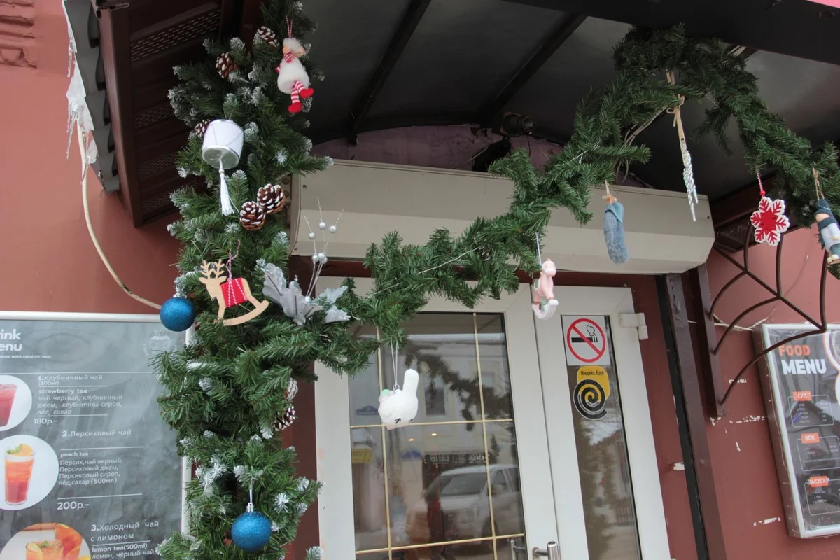 Владельцы магазинов, торговых центров и кафе украсили витрины, ступеньки и двери своих заведений. В основном - еловыми ветками, иногда - с шарами и гирляндами. А в окнах и на балконах калужан переливаются гирлянды.