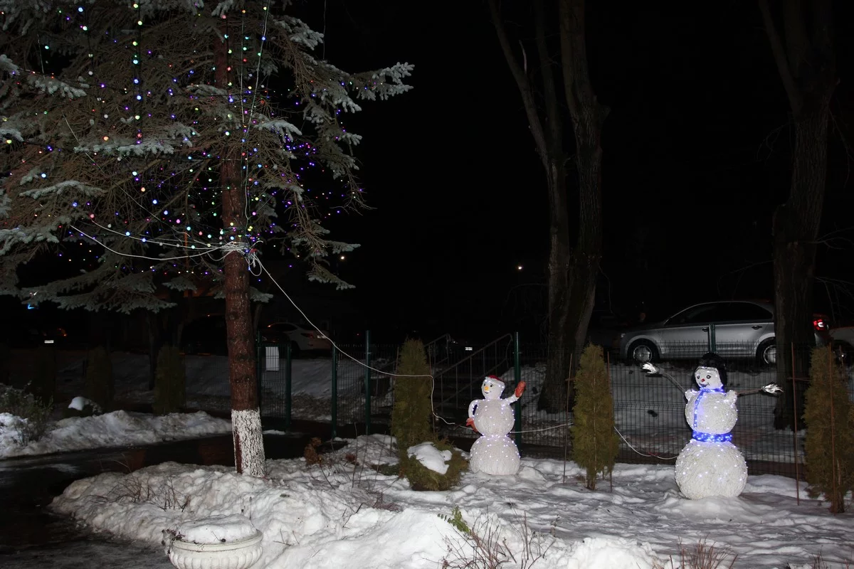 Возле поликлиники №5 - светящиеся конструкция. елка, снеговики.
