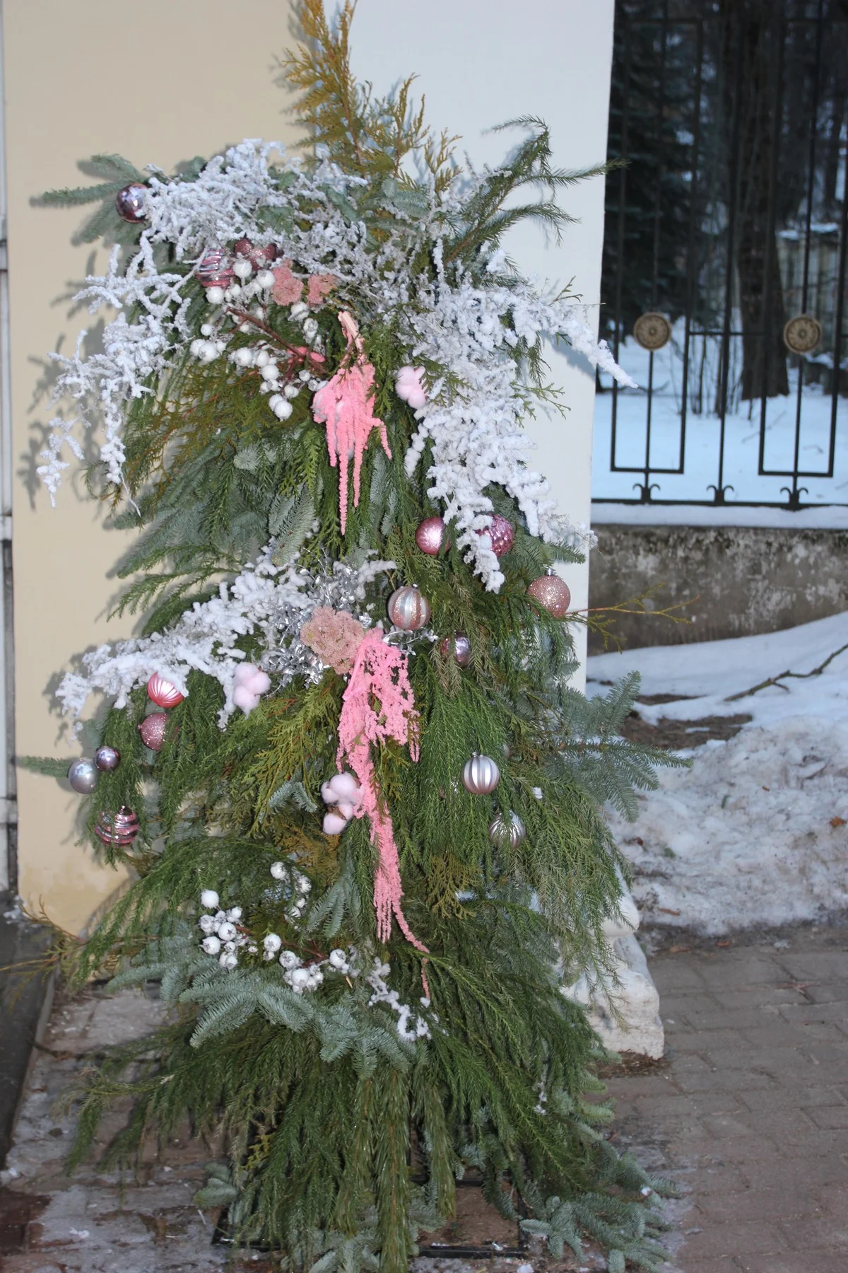 Елки возле магазинов украшают не только шарами, но и бантами, и цветами.