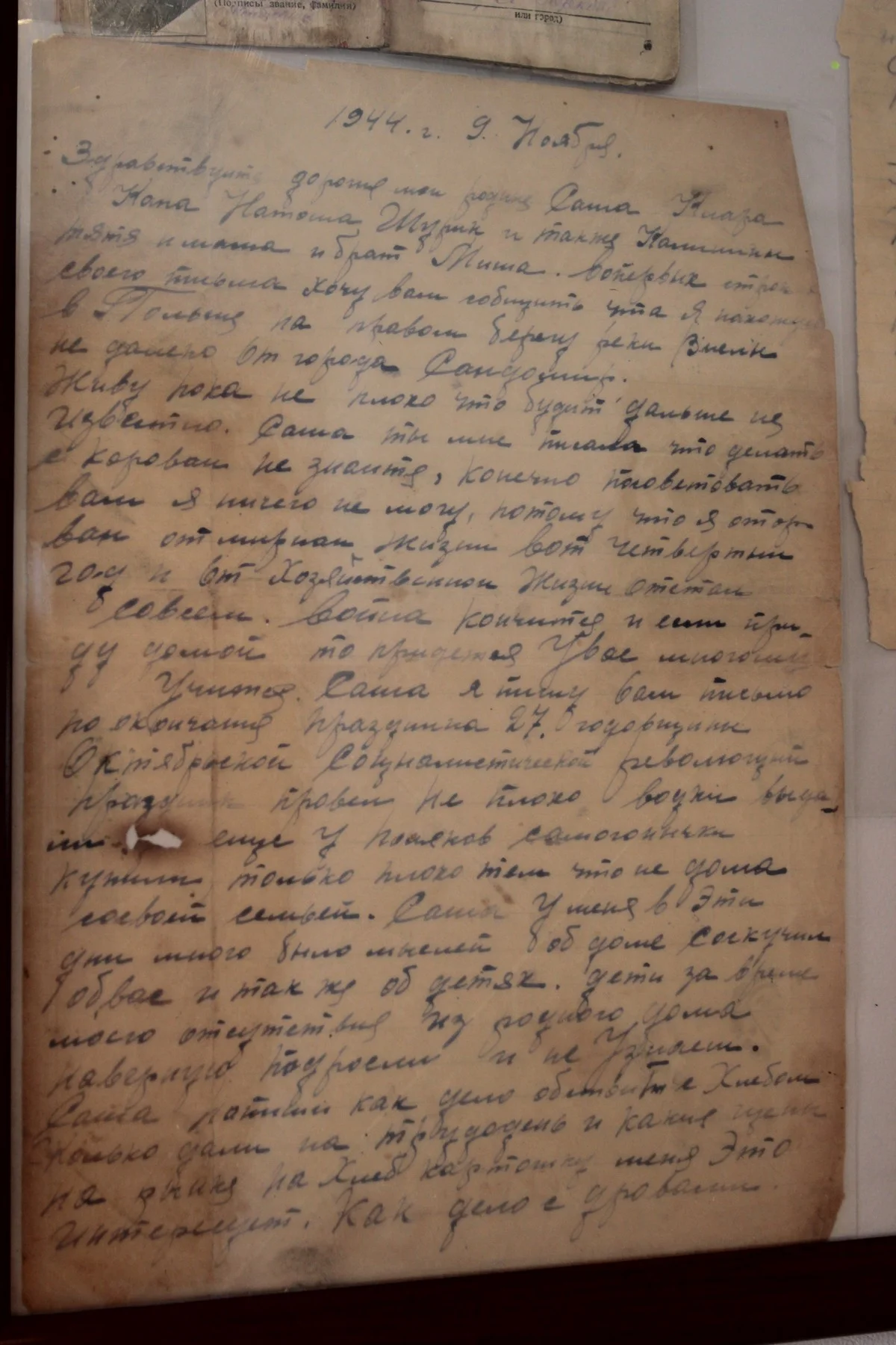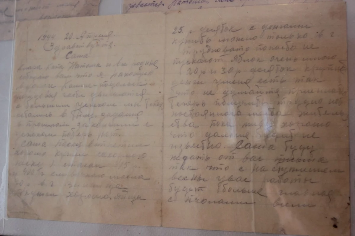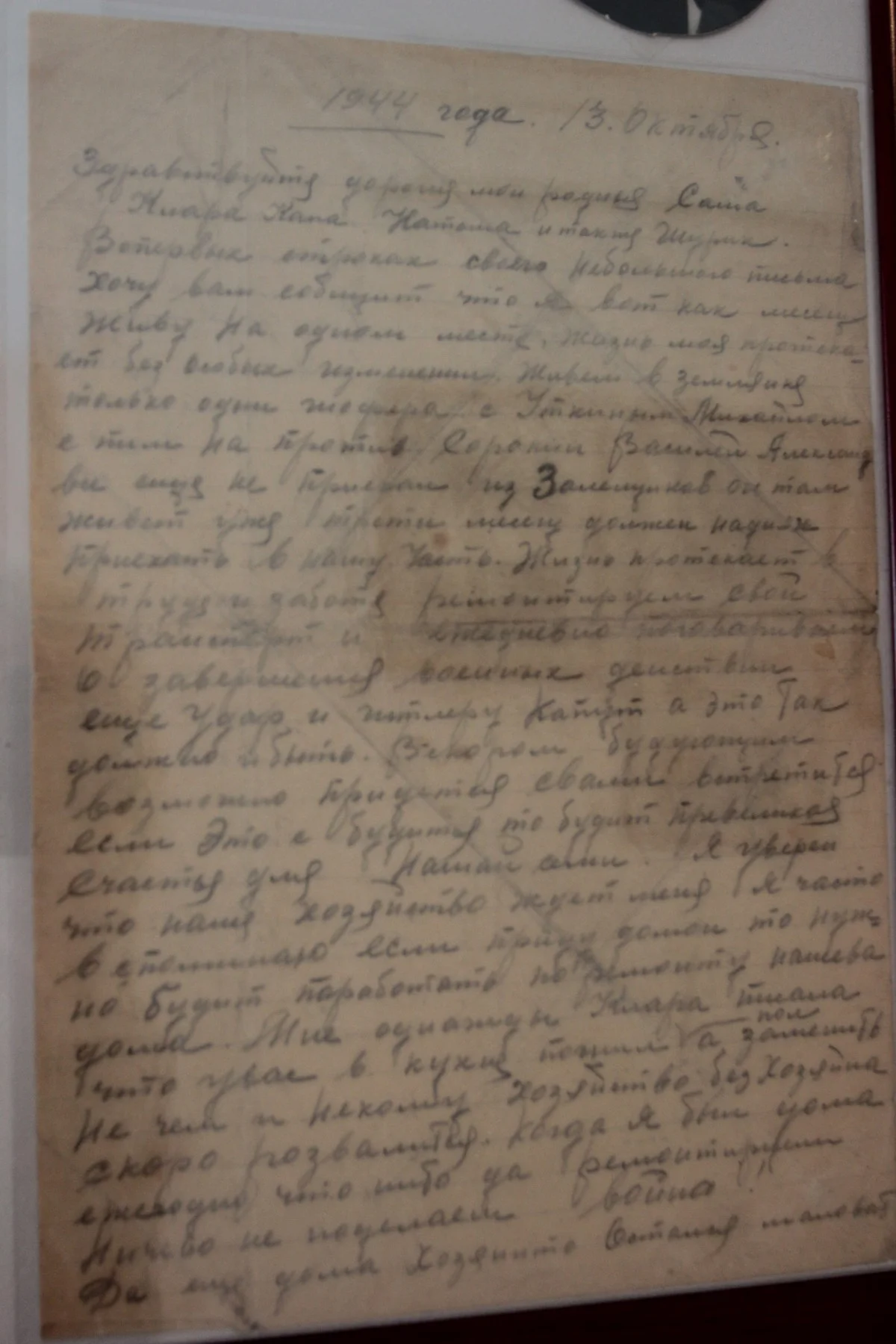 Эти пожелтевшие странички сейчас можно увидеть в Палатах Коробовых и прочитать подлинные строки, написанные на войне.