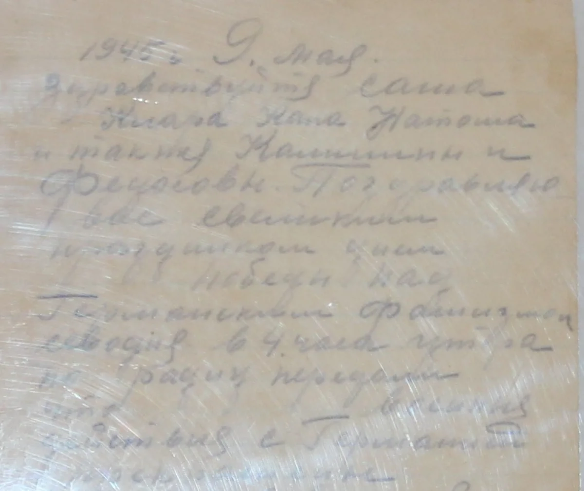 Здравствуйте, Саша, Клара, Капа, Наташа, а также Калинины и Федосовы. Поздравляю вас с великим праздником, Днем Победы над германским фашизмом.