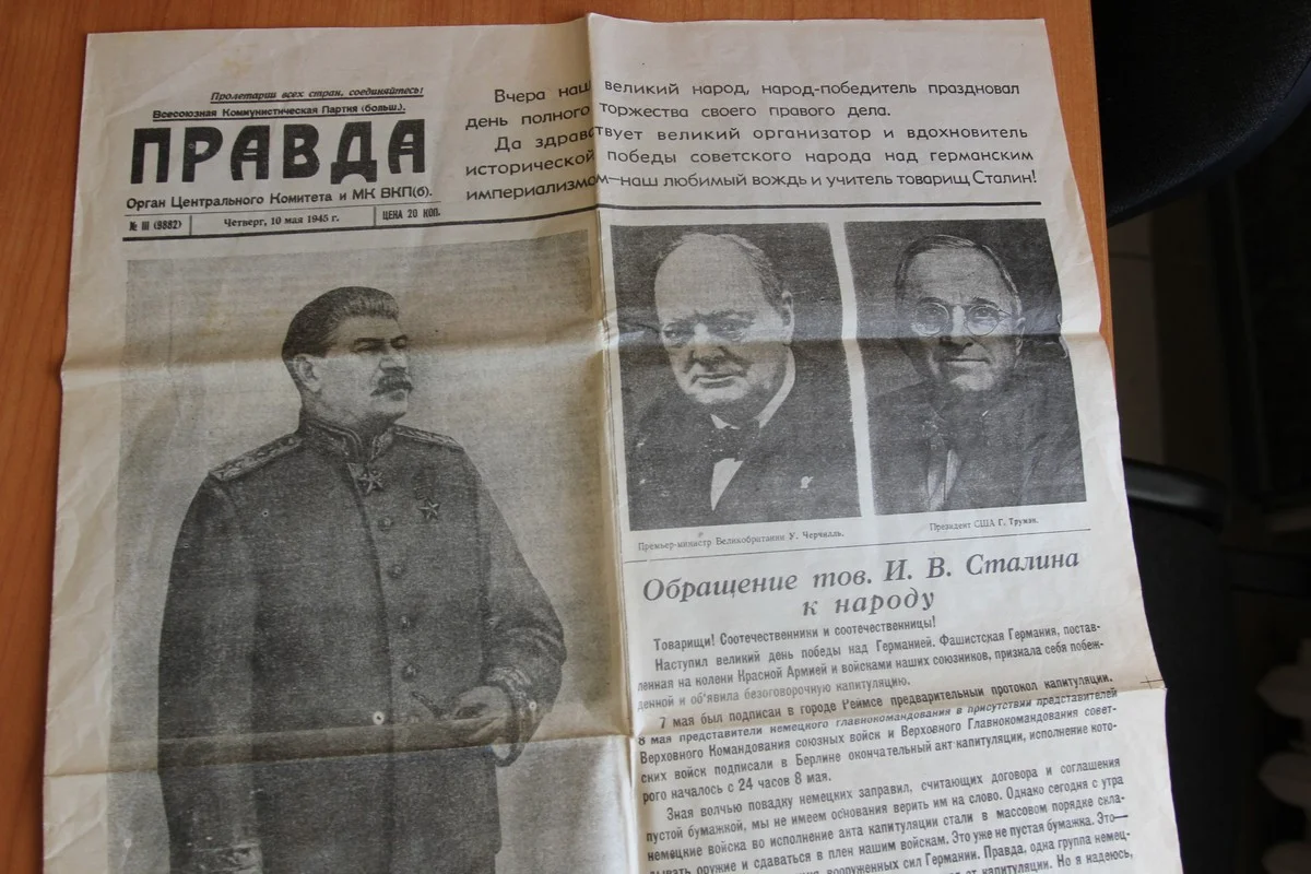 На первой полосе - большой портрет Сталина и его обращение к народу. Обращался он так: «Товарищи! Соотечественники и соотечественницы!». Сталин писал о победе: «7 мая был подписан в городе Реймсе предварительный протокол о капитуляции.