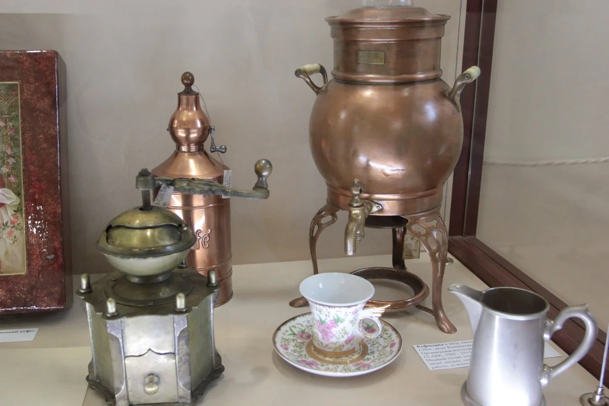 Кофейных предметов меньше, но среди них есть необычные, например, кофейник-кофеварка 1902-1905 г., американская кофеварка в виде самовара, старинные кофемолки, медная шоколадница с длинной ручкой конца ХIХ века.