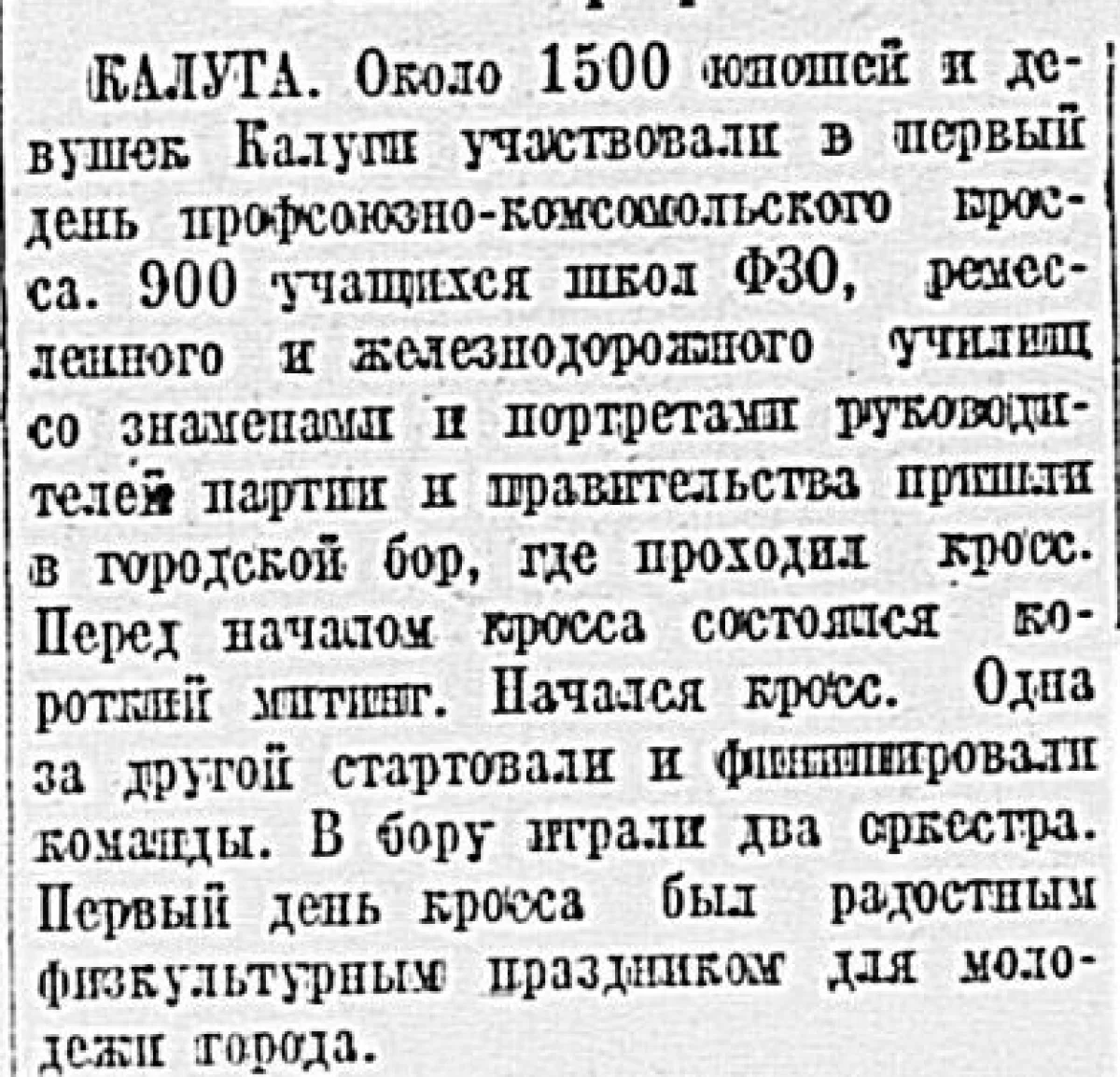 Около 1500 юношей и девушек Калуги участвовали в профсоюзно-комсомольском кроссе. 900 учащихся школ ФЗО, ремесленного и железнодорожного училища со знаменами и портретами руководителей партии и правительства пришли в городской бор, где проходил кросс. Перед началом состоялся короткий митинг. В бору играли два оркестра.