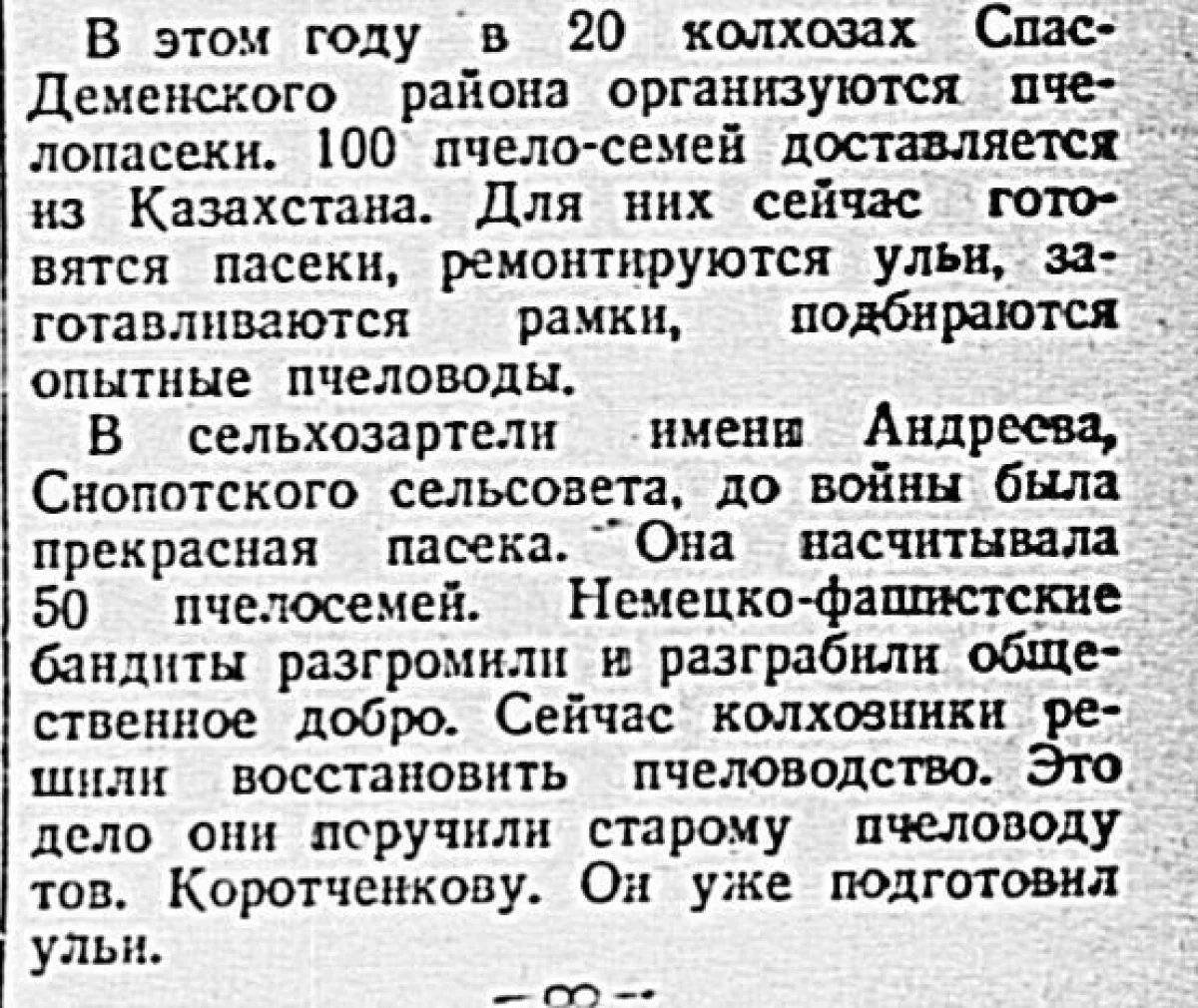 В сельхозартели имени Андреева Снопотского сельсовета до войны была прекрасная пасека. Она насчитывала 50 пчелосемей. Немецко-фашистские бандиты разгромили и разграбили общественное добро. Сейчас колхозники решили восстановить пчеловодство. Это дело они поручили старому пчеловоду тов. Коротченкову. Он уже подготовил ульи.