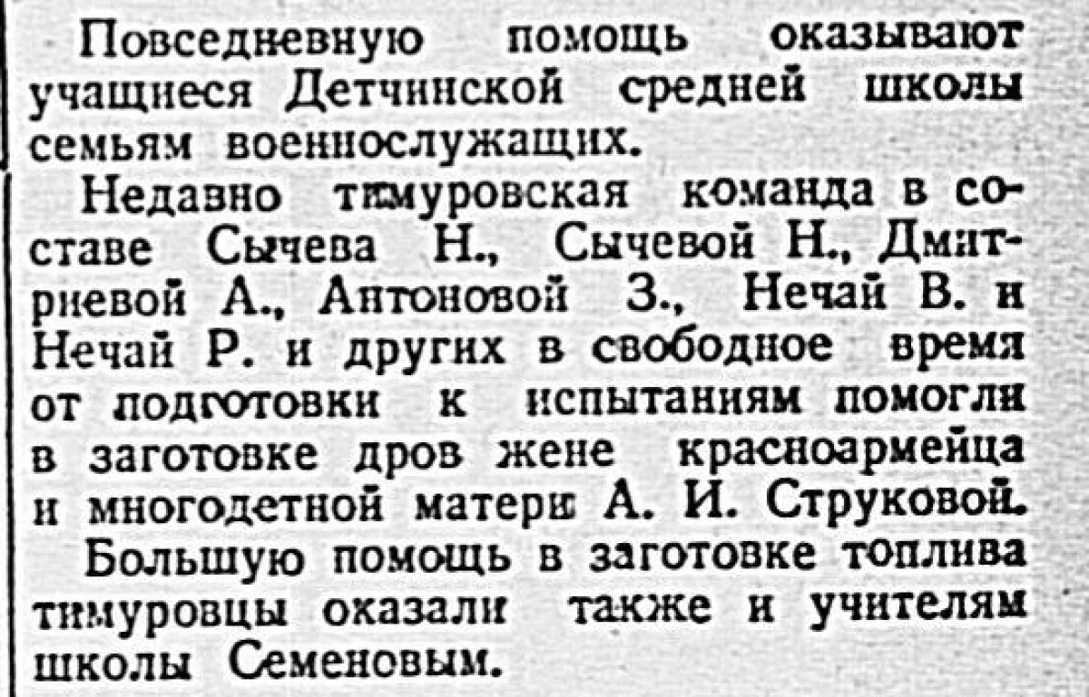 Недавно тимуровская команда в свободное от подготовки к экзаменам время помогла в заготовке дров жене красноармейца и многодетной матери А. И. Струковой. Большую помощь в заготовке топлива тимуровцы оказали также учителям своей школы Семеновым.