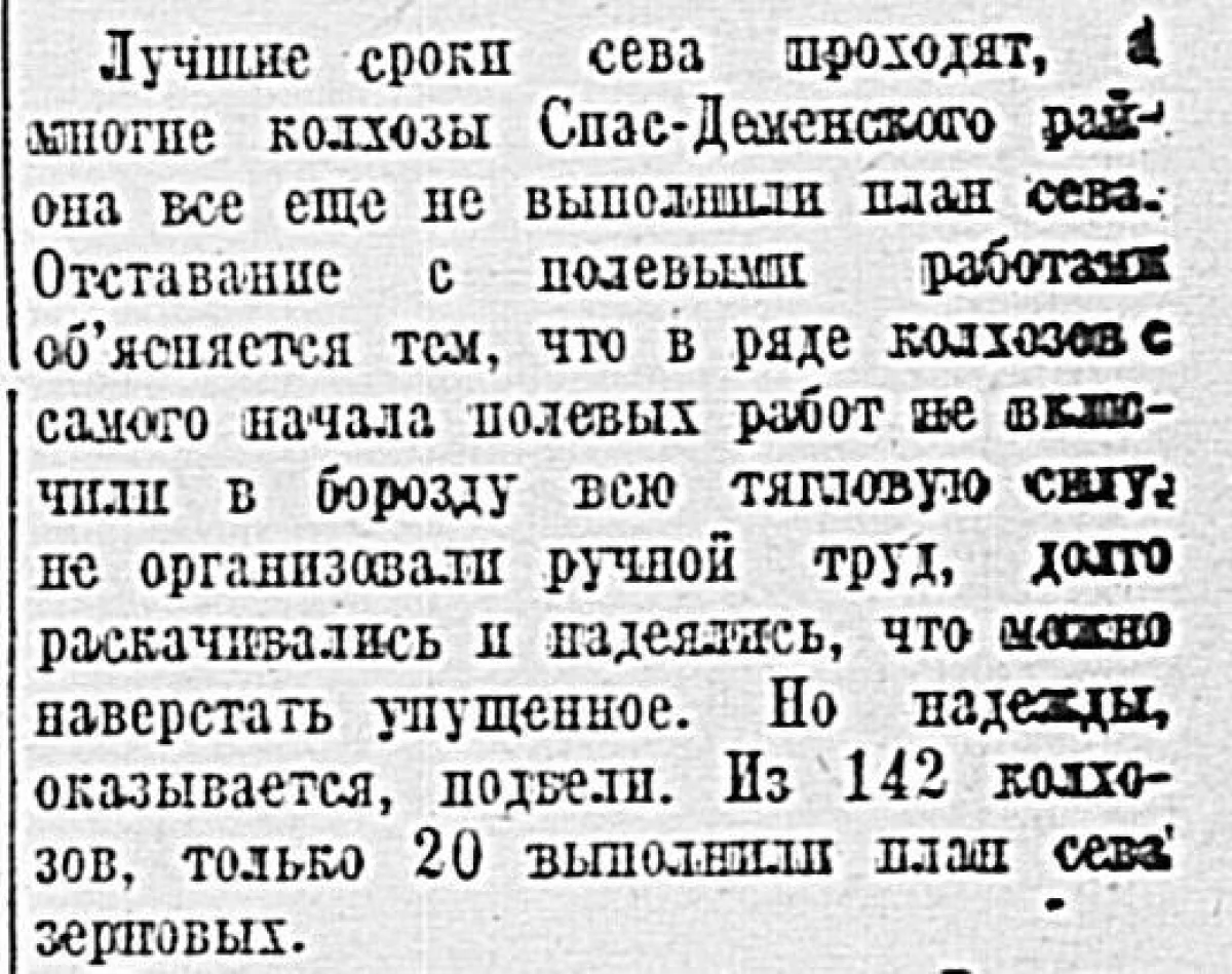 Лучшие сроки сева проходят, а многие колхозы Спас-Деменского района все еще не выполнили план сева. Отставание с полевыми работами объясняется тем, что в ряде колхозов с самого начала полевых работ не вывели в борозду всю тягловую силу: не организовали ручной труд, долго раскачивались и надеялись, что можно наверстать упущенное. Но надежды, оказывается, подвели. Из 142 колхозов только 20 выполнили план сева зерновых.