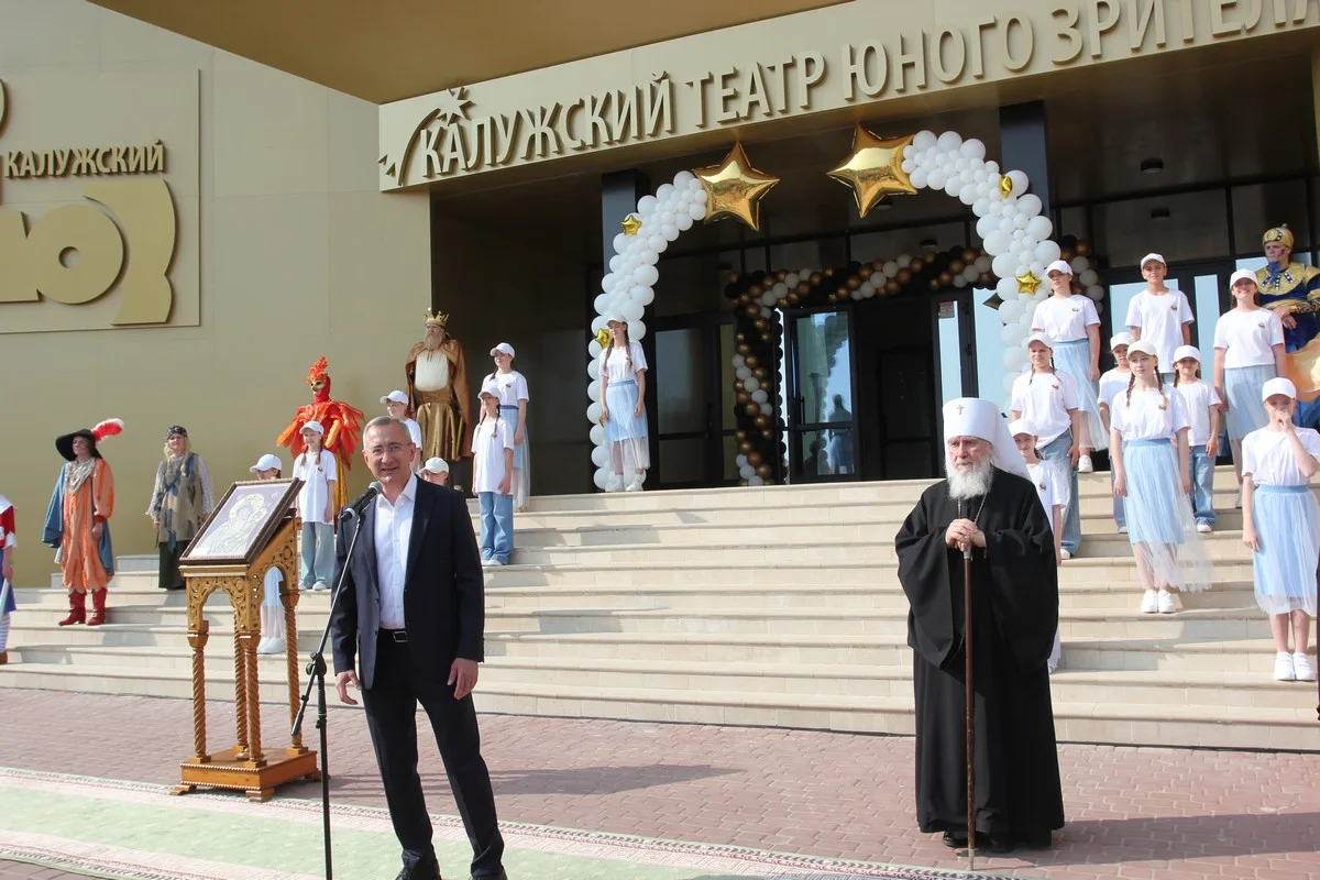 Новое здание театра освятил митрополит Калужский и Боровский Климент, пожелав калужанам иметь побольше детей.