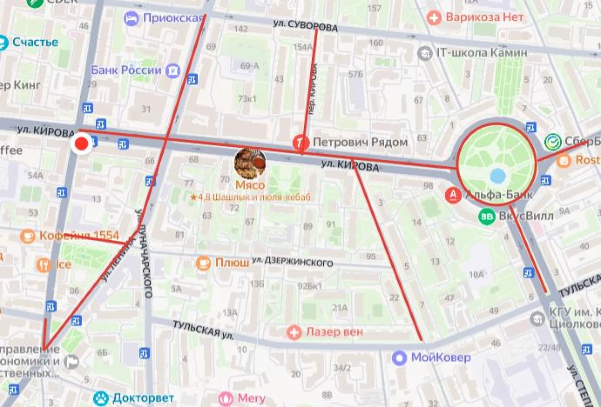 - пл. Мира – ул. Кирова – ул. Московская – ул. Суворова – ул. Тульская, далее по маршруту.