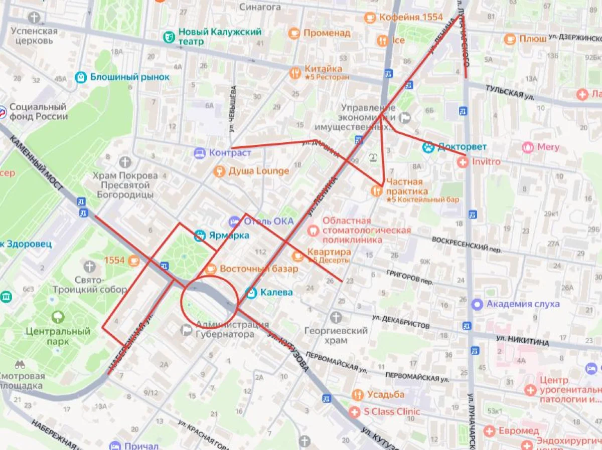 - ст. Калуга-1 – ул. Баррикад – ул. Московская – ул. Кирова, далее по маршруту.