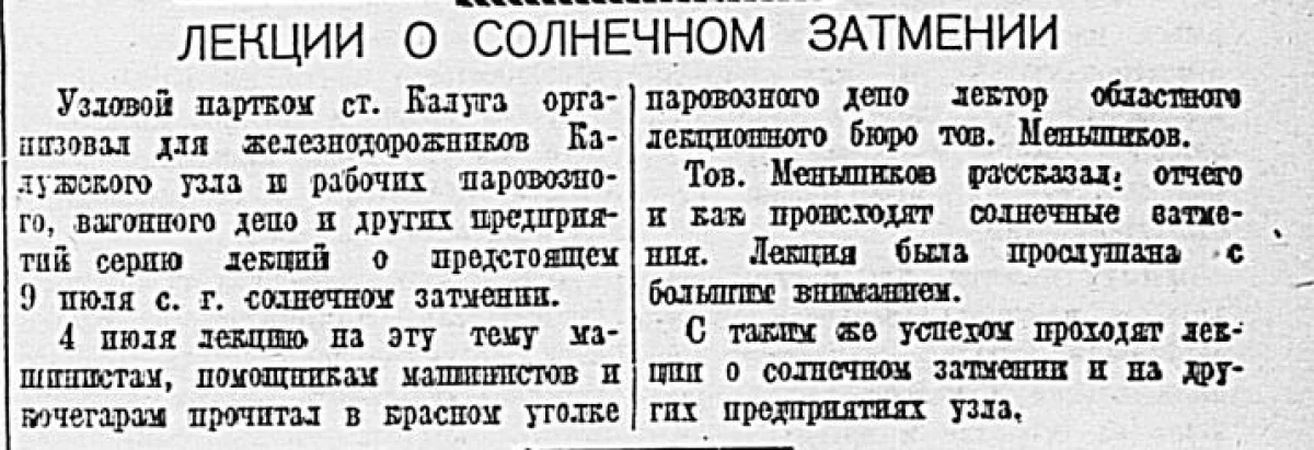 Узловой партком станции Калуга организовал для железнодорожников Калужского узла и рабочих паровозного, вагонного депо и других предприятий серию лекций о предстоящем 9 июля солнечном затмении.