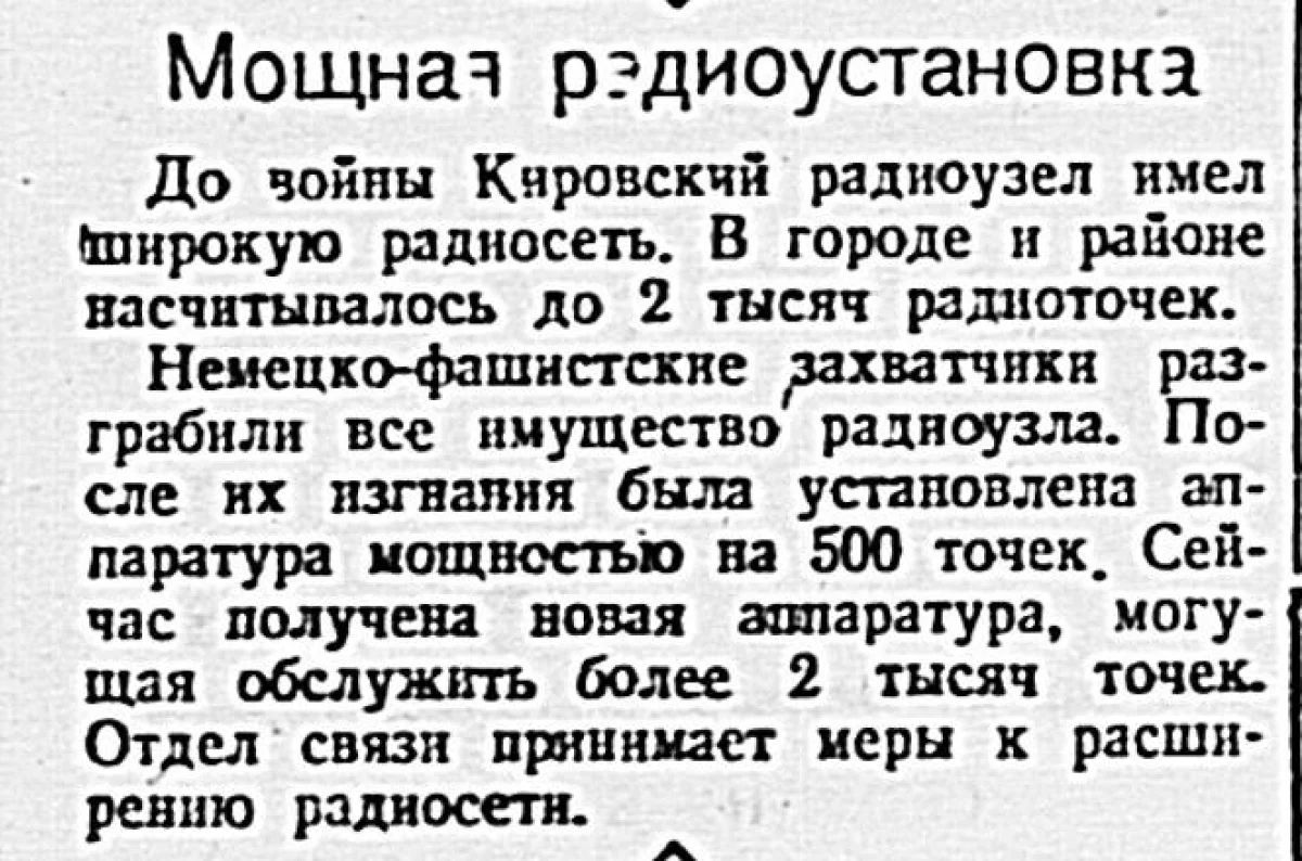 До войны Кировский радиоузел имел широкую радиосеть. В городе и районе насчитывалось до двух тысяч радиоточек.