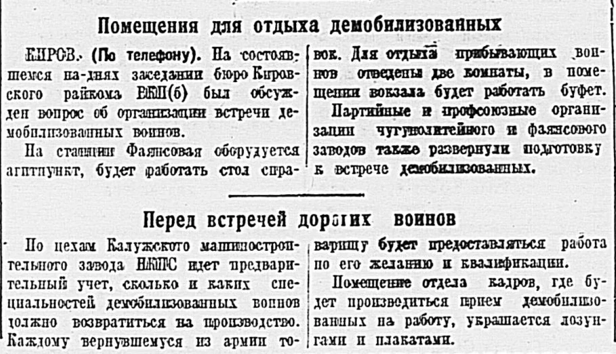 Партийные и профсоюзные организации чугунолитейного и фаянсового заводов также развернули подготовку к встрече демобилизованных.