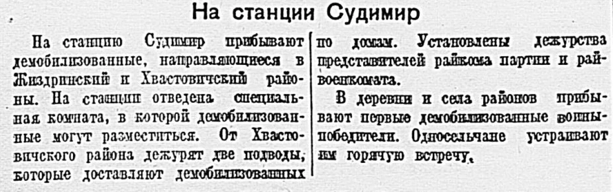 На станцию Судимир прибывают демобилизованные, направляющиеся в Жиздринский и Хвастовичский районы. На станции отведена специальная комната, в которой демобилизованные могут разместиться. От Хвастовичского района дежурят две подводы, которые доставляют демобилизованных по домам. Установлены дежурства представителей райкома партии и райвоенкомата.