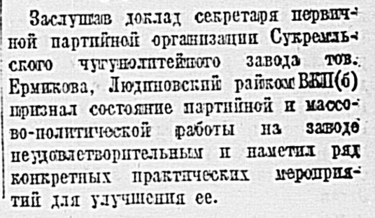 Заслушав доклад секретаря первичной партийной организации Сукремльского чугунолитейного завода тов. Ермикова, Людиновский райком ВКП(б) признал состояние партийной и массово-политической работы на заводе неудовлетворительным и принял ряд конкретных практических мероприятий для ее улучшения.