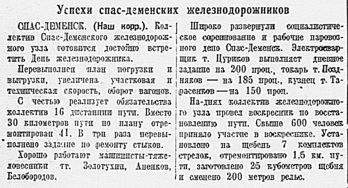 С честью выполняет обязательства коллектив 16-й дистанции пути. Вместо 30 километров пути по плану отремонтирован 41. В три раза перевыполнено задание по ремонту стыков.