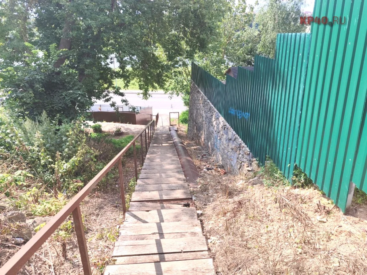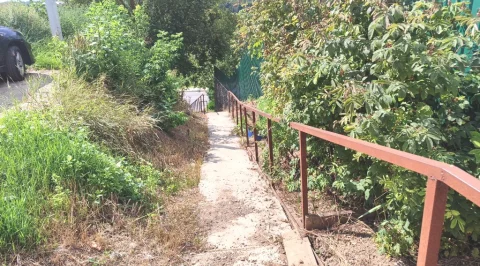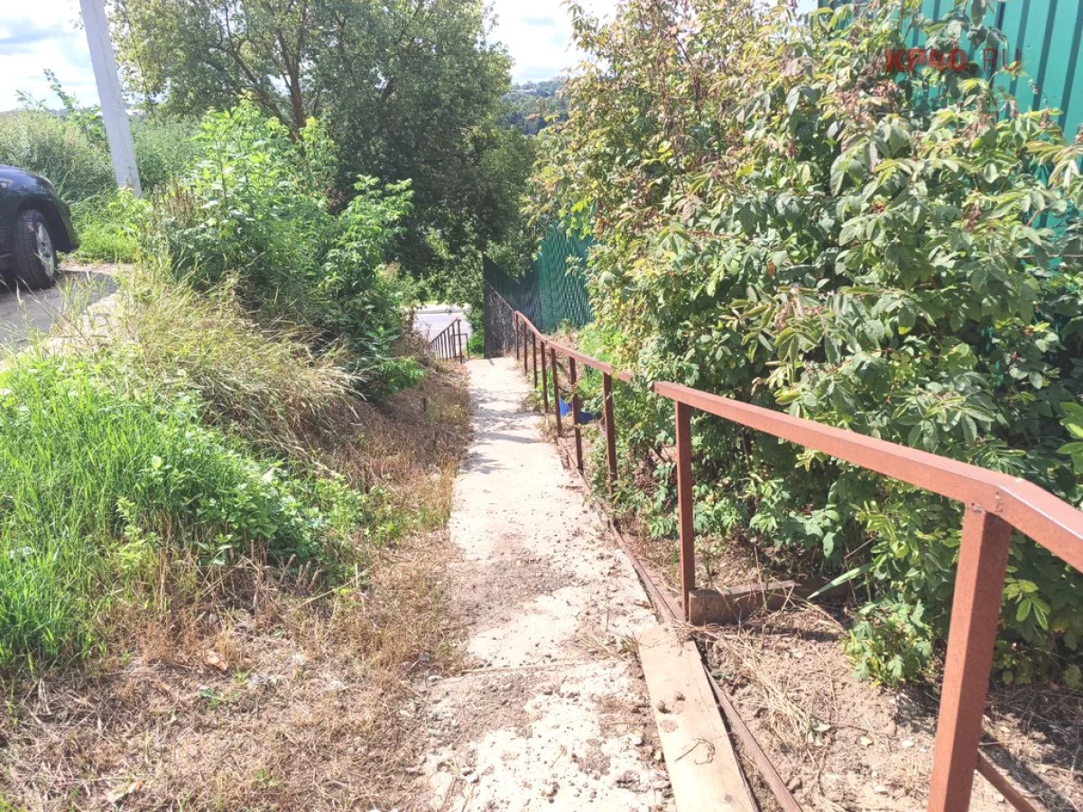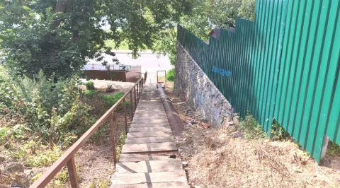 Но есть другая, вполне себе добротная лестница. Чтобы попасть на нее, нужно идти не по Берендяковской, а по улице Баумана. Между частных домов затерялась бетонная до середины, а потом деревянная лестница. По ней мы и спустились.