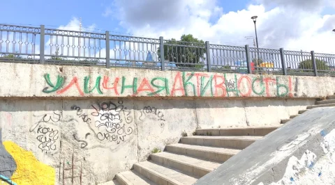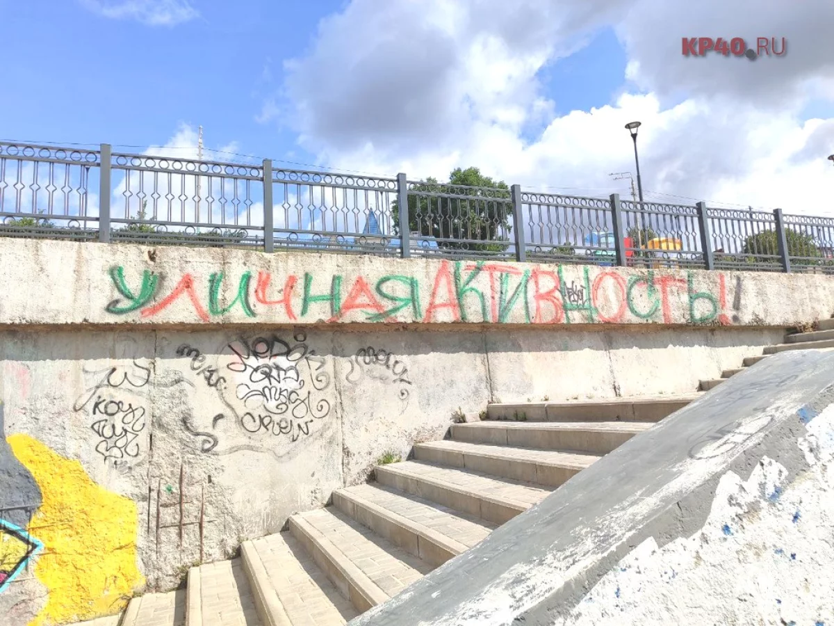 Набережная Оки сегодня пустынна. Одиноко, как пеньки, торчат пара закрытых киосков, а из уличных активностей осталась одна полустертая надпись-граффити.