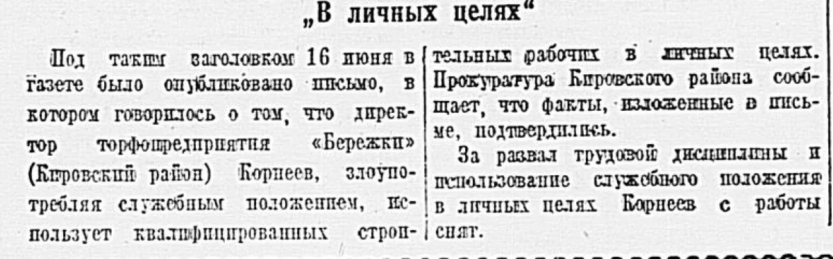 В газете было опубликовано письмо, в котором говорилось о том, что директор торфопредприятия «Бережки» (Кировский район) Корнеев, злоупотребляя служебным положением, использует квалифицированных строительных рабочих в личных целях. Прокуратура Кировского района сообщает, что факты, изложенные в письме, подтвердились.