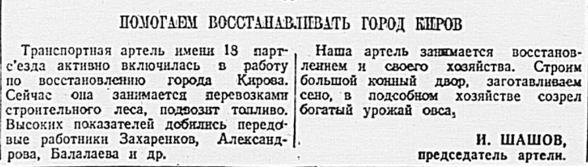 Транспортная артель имени 18 партсъезда активно включилась в работу по восстановлению города Кирова.