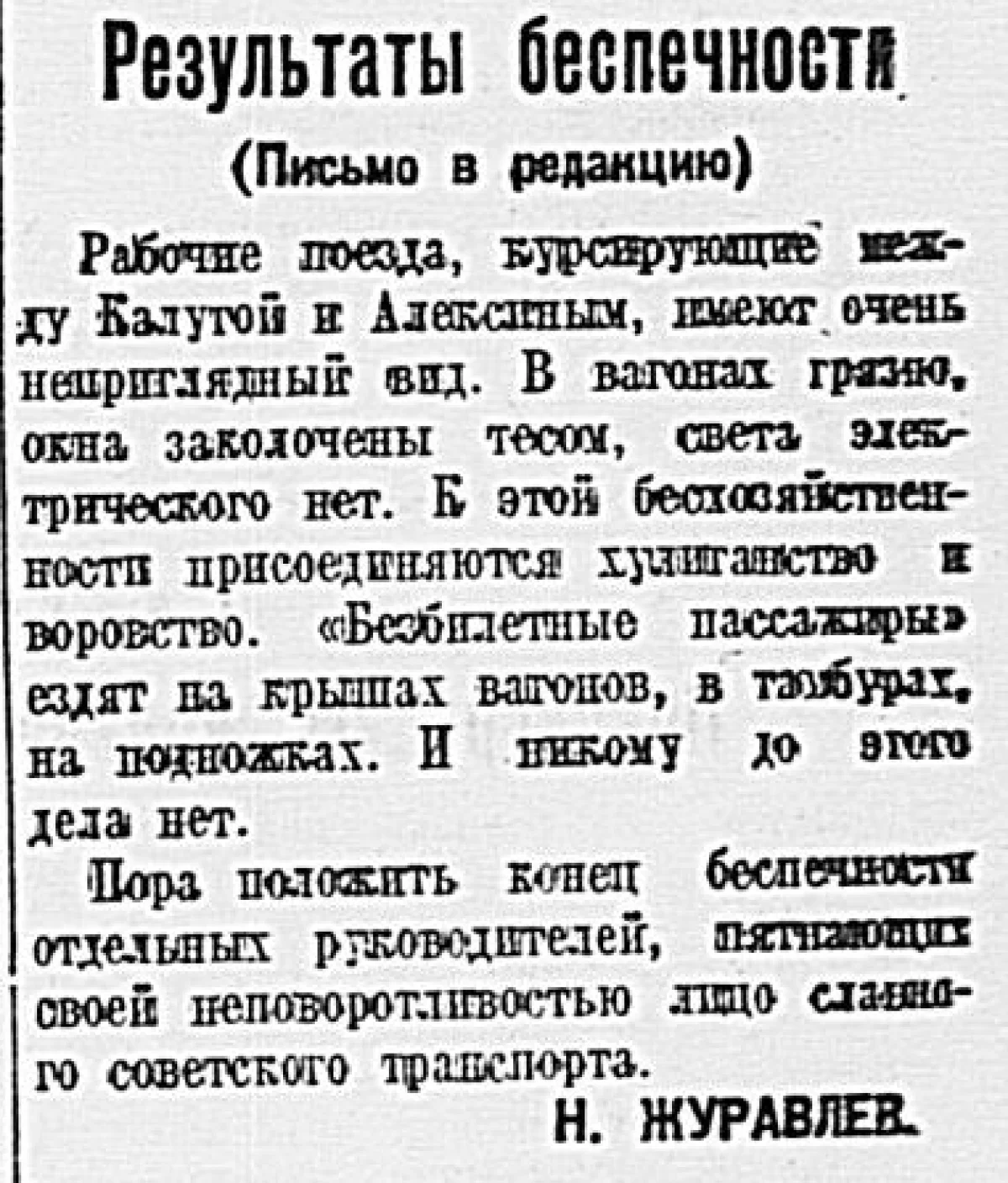 Рабочие поезда, курсирующие между Калугой и Алексиным, имеют очень неприглядный вид. В вагонах грязно, окна заколочены тесом, света электрического нет. В этой беспечности присоединяются хулиганство и воровство. «Безбилетные пассажиры» ездят на крышах вагонов, в тамбурах, на подножках. И никому до этого дела нет. - Пора положить конец беспечности отдельных руководителей, пятнающих своей неповоротливостью лицо славного советского транспорта, пишет в редакцию читатель Н. Нуравлев.